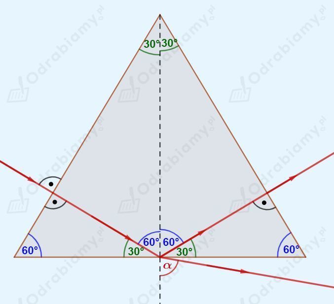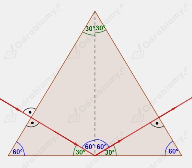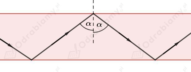 Kąt graniczny dla granicy ośrodków szkło-powietrze wynosi 42°. Kąt padania w naszym przypadku będzie równy 60°. Dla kąta padania większego od kąta granicznego zachodzi zjawisko całkowitego wewnętrznego odbicia.