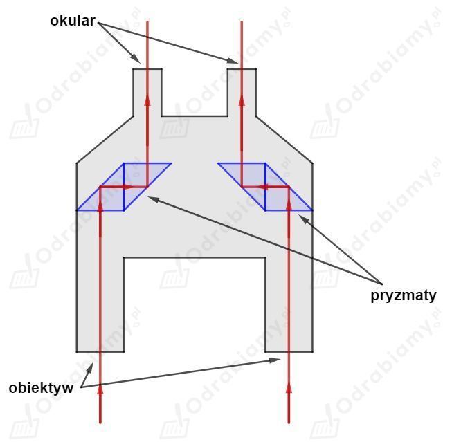 Poniższy schemat budowy lornetki przedstawia uproszczoną ideę tego rozwiązania (na schemacie pominięto układy soczewek niezbędne do działania lornetki):