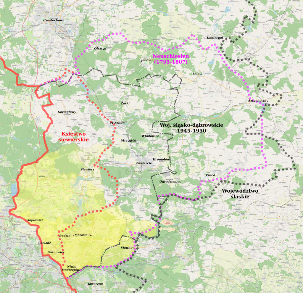 Historyczne granice polityczno-administracyjne wokół Zagłębia Dąbrowskiego: