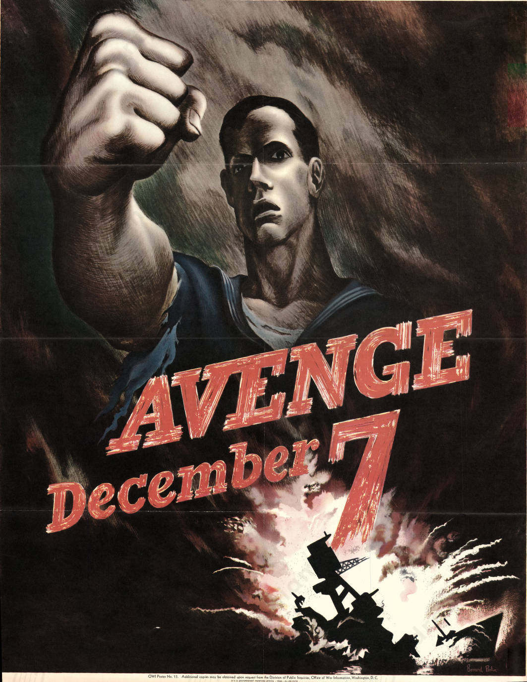 2) Tak, orędzie Roosevelta, którego celem było uchwalenie przez Kongres stanu wojny między USA a Japonią, wyrażało postulat przedstawiony na plakacie. Grafika wzywała do pomszczenia ataku Japończyków na Pearl Harbour z morza i powietrza.