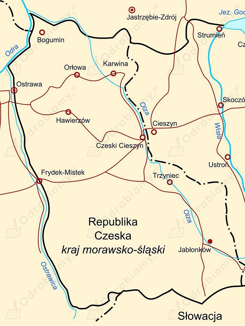 Współczesna mapa czeskiego Śląska Cieszyńskiego (Zaolzie stanowi jego wschodnią część)