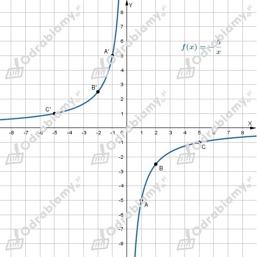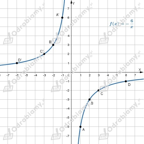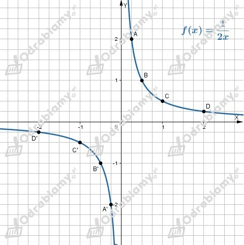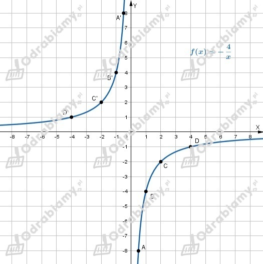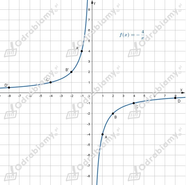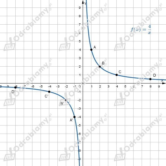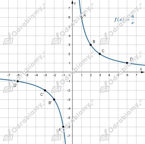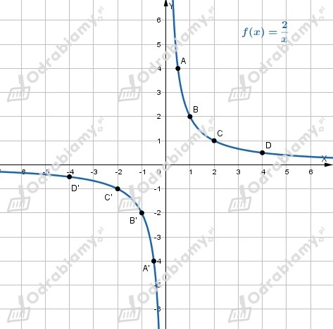 Obliczamy wartości funkcji dla kilku argumentów z dziedziny D=R\{0} i przedstawiamy je w tabeli: