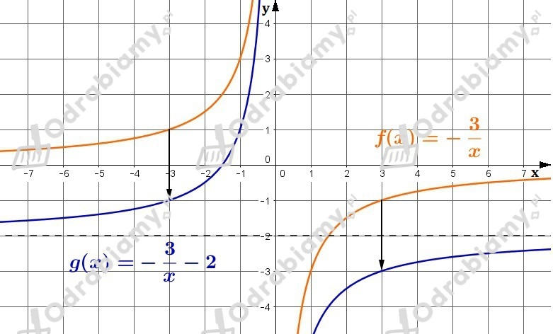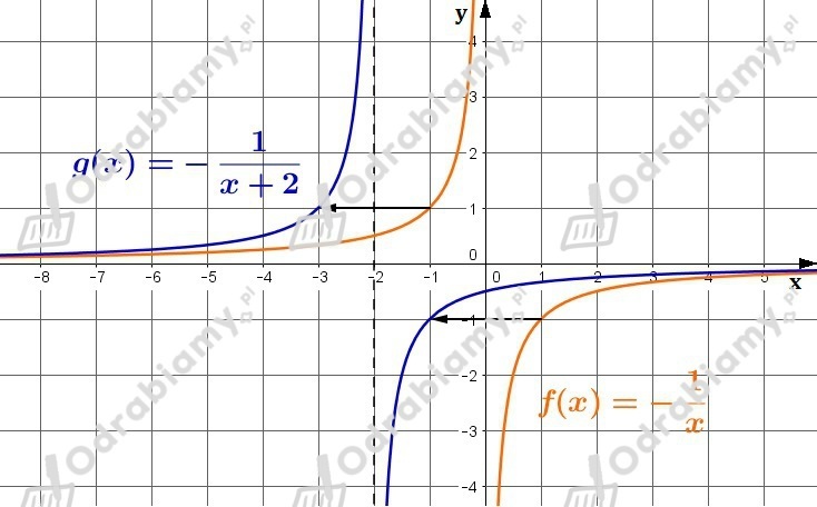 Wykres funkcji g(x) otrzymujemy przez przesunięcie wykresu funkcji f(x) o wektor [-2,0], czyli o 2 jednostki w lewo.