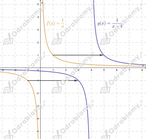 Wykres funkcji g(x) otrzymujemy przez przesunięcie wykresu funkcji f(x) o wektor [4,0], czyli o 4 jednostki w prawo.