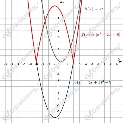 Wykres funkcji f(x)=|x2+2x-8| otrzymamy, szkicując na podstawie wykresu funkcji g(x) wykres funkcji f(x)=|g(x)|.