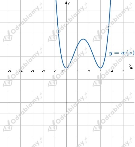 Współczynnik przy najwyższej potędze zmiennej x jest dodatni, więc wykres wielomianu zaczynamy rysować od prawej strony od góry. Liczby 0, 3 są pierwiastkami dwukrotnymi, więc dla x=0, x=3 wielomian nie zmienia znaku (wykres "odbija" się od osi X).