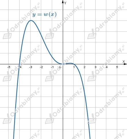 Współczynnik przy najwyższej potędze zmiennej x jest ujemny, więc wykres wielomianu zaczynamy rysować od prawej strony od dołu. Liczba 0 jest pierwiastkiem dwukrotnym, a liczby -4, 1 - pierwiastkami jednokrotnymi, więc dla x=-4, x=1 wielomian zmienia znak, a dla x=0 wielomian nie zmienia znaku (wykres "odbija" się od osi X).