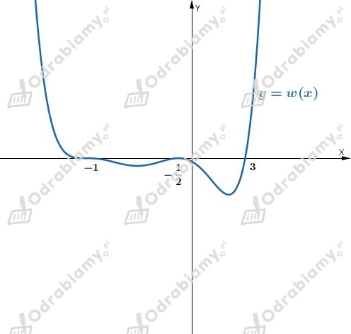 Współczynnik przy najwyższej potędze zmiennej x jest dodatni, więc wykres wielomianu zaczynamy rysować od prawej strony od góry. Liczba -1/2 jest pierwiastkiem parzystokrotnym, a liczby -1, 3 - pierwiastkami nieparzystokrotnymi, więc dla x=-1, x=3 wielomian zmienia znak, a dla x=-1/2 wielomian nie zmienia znaku (wykres "odbija" się od osi X).