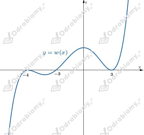 Współczynnik przy najwyższej potędze zmiennej x jest dodatni, więc wykres wielomianu zaczynamy rysować od prawej strony od góry. Liczby -4, 3 są pierwiastkami dwukrotnymi, a liczba -3 - pierwiastkiem jednokrotnym, więc dla x=-3 wielomian zmienia znak, a dla x=-4, x=3 wielomian nie zmienia znaku (wykres "odbija" się od osi X).