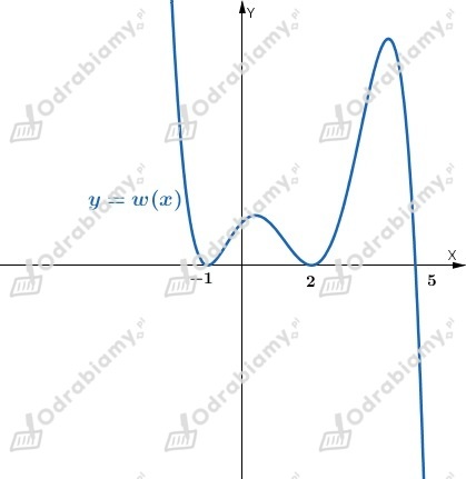 Współczynnik przy najwyższej potędze zmiennej x jest ujemny, więc wykres wielomianu zaczynamy rysować od prawej strony od dołu. Liczby -1, 2 są pierwiastkami dwukrotnymi, a liczba 5 - pierwiastkiem jednokrotnym, więc dla x=5 wielomian zmienia znak, a dla x=-1, x=2 wielomian nie zmienia znaku (wykres "odbija" się od osi X).