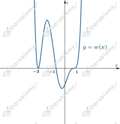 Współczynnik przy najwyższej potędze zmiennej x jest dodatni, więc wykres wielomianu zaczynamy rysować od prawej strony od góry. Liczba -3 jest pierwiastkiem parzystokrotnym, a liczby -1, 1 - pierwiastkami nieparzystokrotnymi, więc dla x=-1, x=1 wielomian zmienia znak, a dla x=-3 wielomian nie zmienia znaku (wykres "odbija" się od osi X).