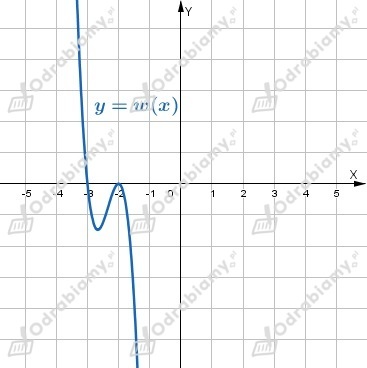 Współczynnik przy najwyższej potędze zmiennej x jest ujemny, więc wykres wielomianu zaczynamy rysować od prawej strony od dołu. Liczba -2 jest pierwiastkiem dwukrotnym, a liczba -3 - pierwiastkiem jednokrotnym, więc dla x=-3 wielomian zmienia znak, a dla x=-2 wielomian nie zmienia znaku (wykres "odbija" się od osi X).