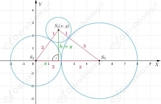 Z treści zadania wiemy, że okrąg o środku w punkcie S i promieniu 1 jest styczny wewnętrznie do okręgów