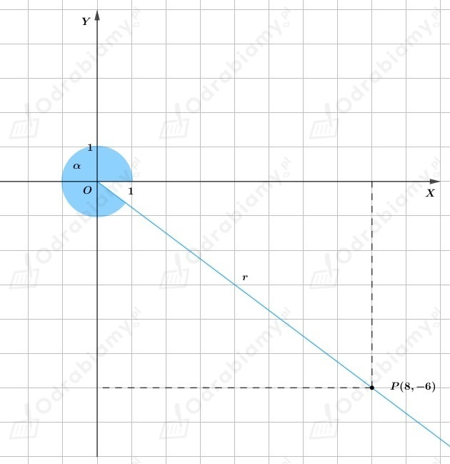 Z treści zadania wiemy, że do ramienia końcowego kąta 𝛼 należy punkt P(8,-6).
