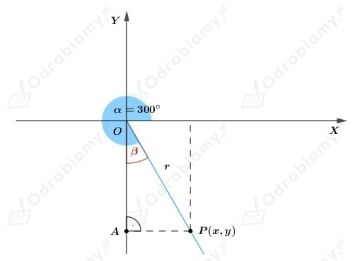 Do wyznaczenia wartości funkcji trygonometrycznych potrzeba znajomość współrzędnych punktu P (dowolnego punktu leżącego na ramieniu końcowym kąta 𝛼).
