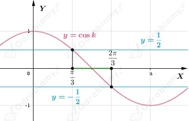 Z wykresu funkcji trygonometrycznej cosinus i tabelki wartości odczytujemy, że