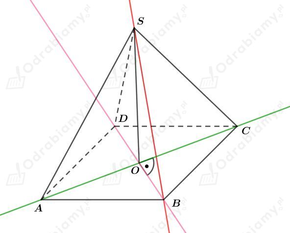 Rzutem prostokątnym punktu S na płaszczyznę ABCD jest punkt O, czyli rzutem prostokątnym prostej BS na płaszczyznę ABCD jest prosta BD.