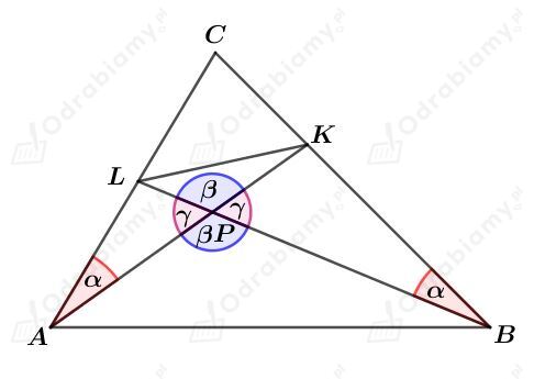 Rozważmy trójkąty APL i BPK. Skoro miary dwóch odpowiadających kątów w trójkącie są równe, to miary trzecich kątów również są równe.