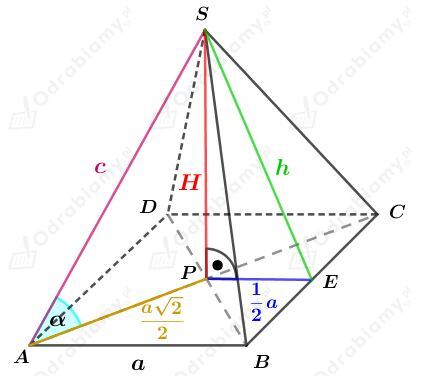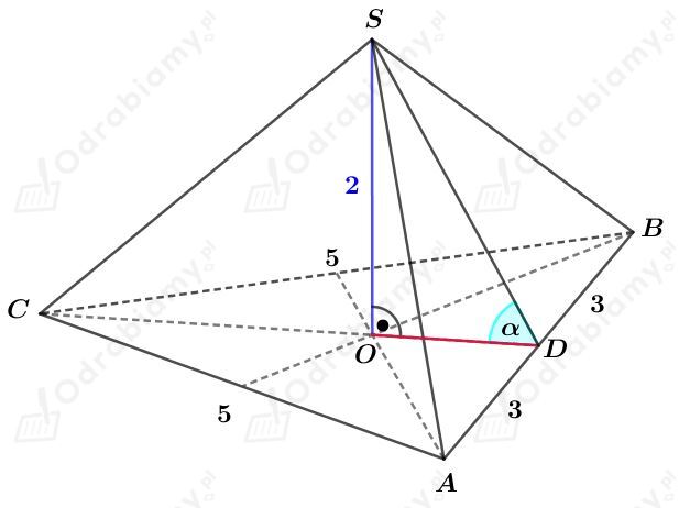 Wyznaczmy tangens kąta nachylenia ściany ABS do podstawy tego ostrosłupa. Mamy: