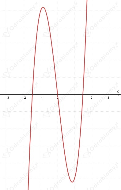 Wobec tego pochodna zmienia z znak z dodatniego na ujemny w punkcie x=1 oraz z ujemnego na dodatni w x=-1.