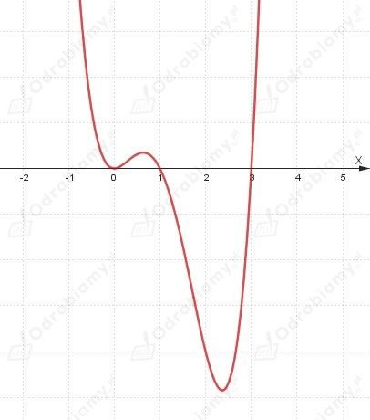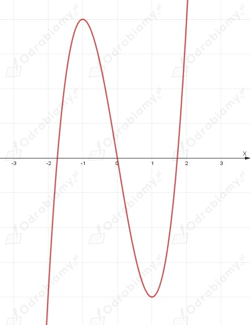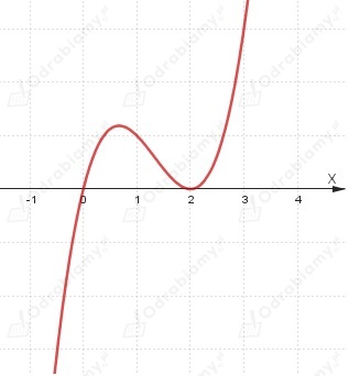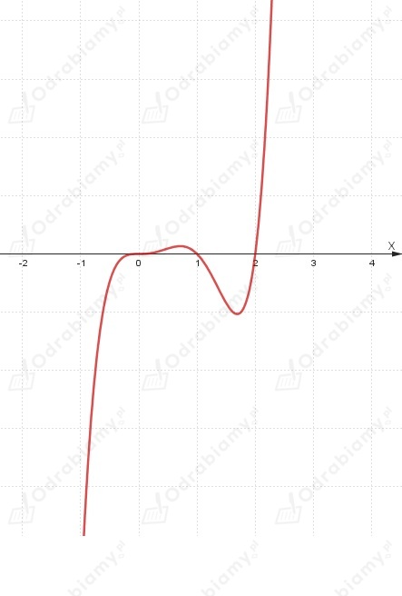 Wobec tego pochodna zmienia z znak z dodatniego na ujemny w punkcie x=0 oraz z ujemnego na dodatni w x=2.