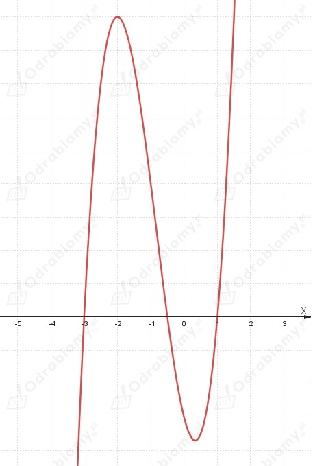 Funkcja pochodna zmienia znak z dodatniego na ujemny w x=1 oraz z ujemnego na dodatni w x=3.