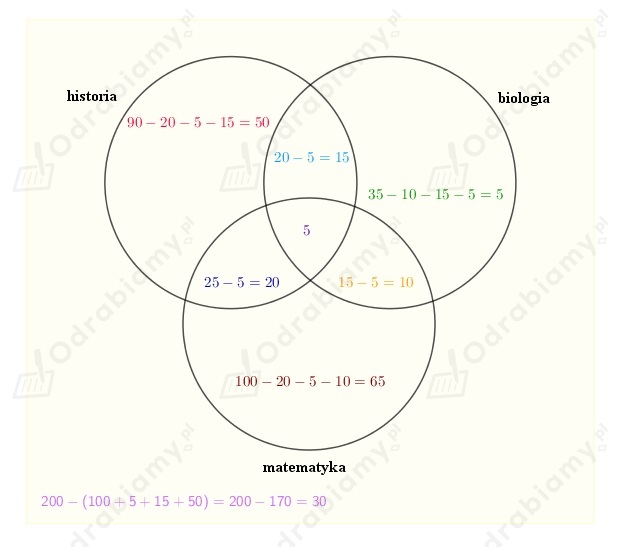 lubią zarówno matematykę, historię i biologię (5 osób), następnie 20 osób, które lubią historię