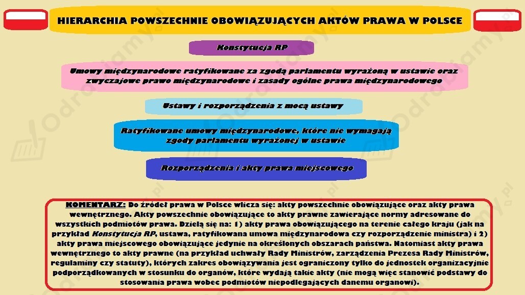 Zgodnie z hierarchią aktów prawnych w Polsce najważniejszym aktem prawnym jest Konstytucja RP, a w dalszej kolejności ratyfikowane umowy międzynarodowe; rozporządzenia, dyrektywy oraz decyzje UE; ustawy, rozporządzenia z mocą ustawy; uchwały, zarządzenia (akty prawa wewnętrznego), akty prawa miejscowego.